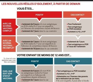 ·       Les règles et durées d’isolement des cas positifs et des cas contacts vont évoluer au niveau national. Pour de plus amples informations, il est possible de consulter le site mesconseilscovid.sante.gouv.fr (Isolement, tests, vaccins, attestations, contact à risque…)